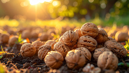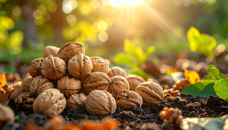 A pile of walnuts rests on the soil, bathed in warm sunlight with a blurred, bokeh-filled background.