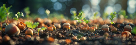 Emerging Life: Tiny Acorns Sprouting in the Soft, Fertile Soil of a Lush Spring Forest