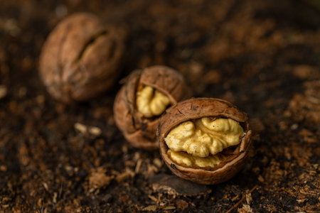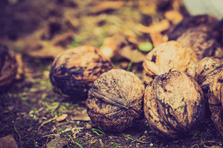 Whole walnuts outdoors on ground. Healthy food full of omega 3 fatty acids, healthy nutrition.
