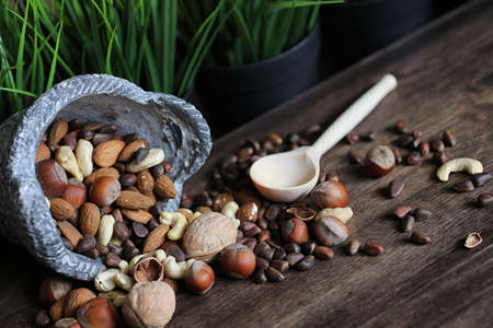 Various useful and tasty nuts on a wooden table and pots with green grass