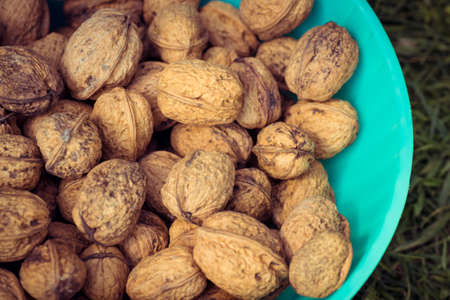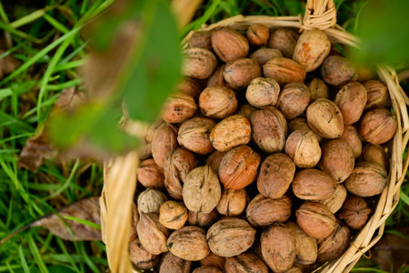 Top view of freshly harvested dried walnuts in their shells in a basket, placed in the grass, under the leaves of the walnut tree