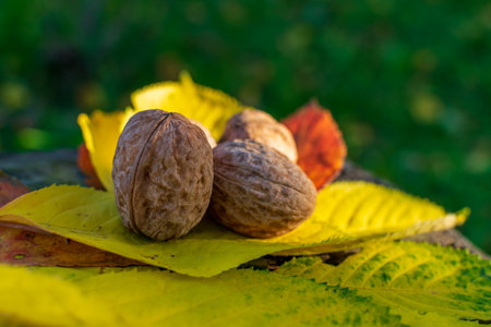 Natural walnuts among fall colored leaves enlightened by sunset light.