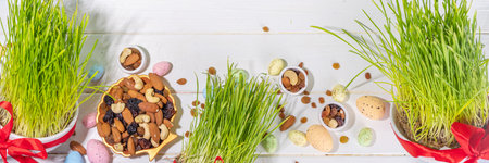 Happy Nowruz holiday background. Celebrating Nowruz new year sweets and treats, dried fruits, nuts, seeds, wooden background with green grass and festive red ribbon, copy space