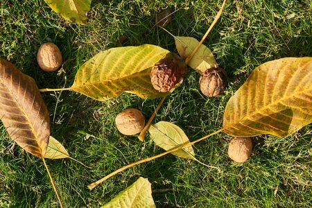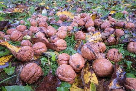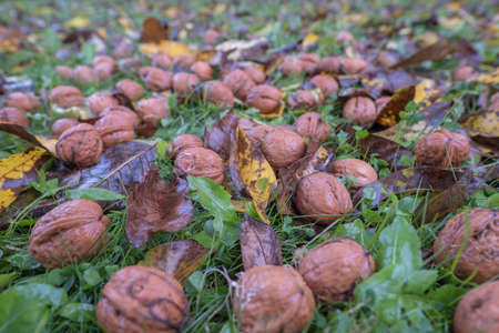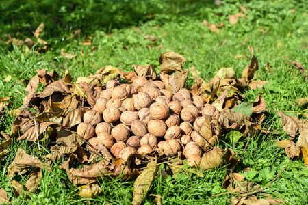 walnuts in shells on the ground. Collecting nuts in the fall in the garden.