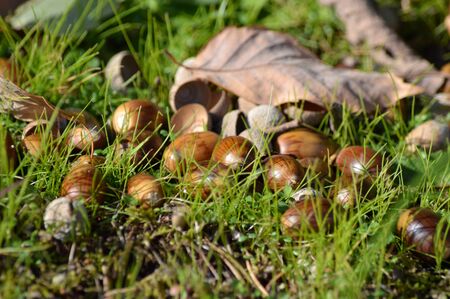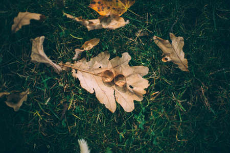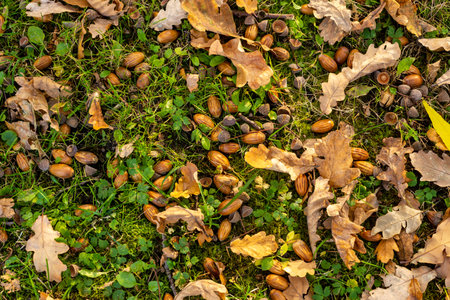 Fallen acorns lying on green grass among fallen oak leaves