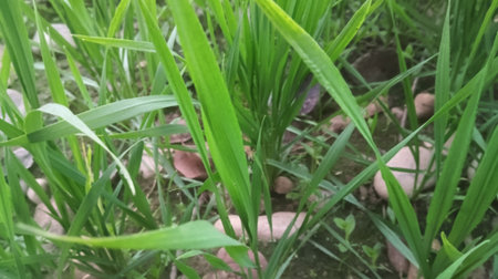 The background of green grass growing in a field outdoors in summer