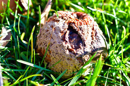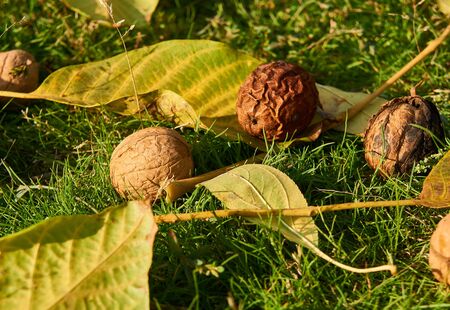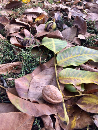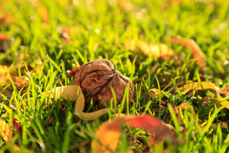 walnut fell from a tree, lying on the ground. Natural picture