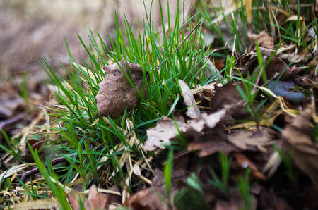 withered autumn grass with leaves and acorns