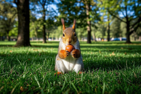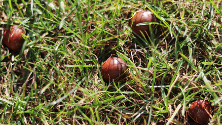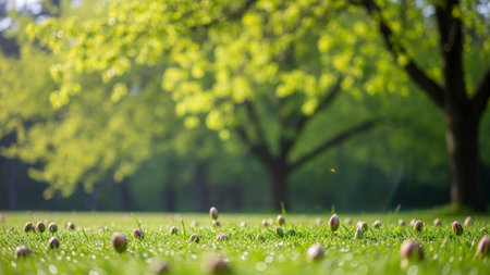 Scattered acorn caps on green grass in a park during autumn season