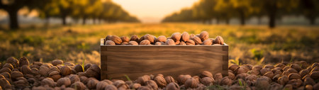 Walnuts are scattered on the ground, illuminated by the warm glow of golden hour sunlight and a bokeh background.
