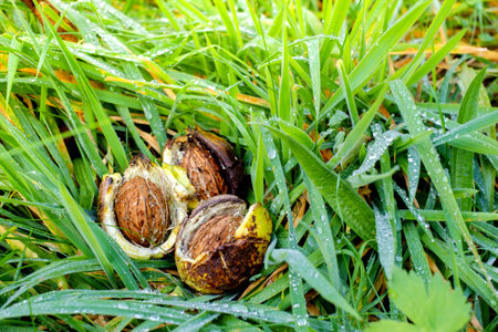 Walnuts in the grass, cracked shells, wet forest and dew