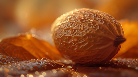 Macro walnut shell with gold glitter on dry leaves. Magical autumn scene for holiday decorations or nature backgrounds.