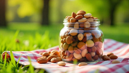 Jar of assorted nuts displayed on a picnic blanket