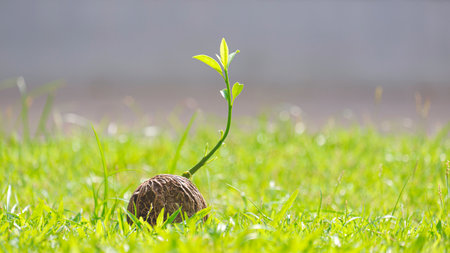 Young sprout growing from dry Cerbera odollam seed on green lawn with blurred background
