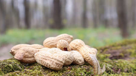 Unpeeled whole raw peanuts in brown husks in the shell texture on a beautiful natural background in the forest lies in a heap on a tree, outdoors on a sunny summer day