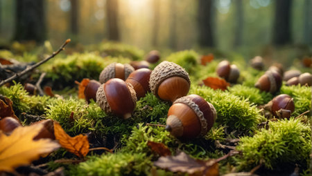 Two acorns resting on the ground, surrounded by dry leaves and small pebbles, create a tranquil autumn scene, capturing the essence of the fall season in natures beauty