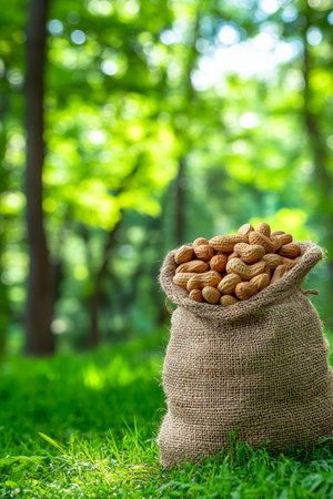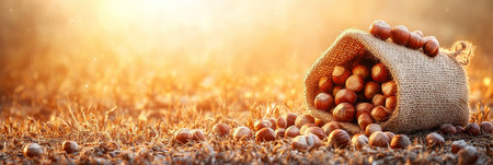 Hazelnuts spilling from a burlap sack in a sunlit field, capturing the essence of autumn harvest.
