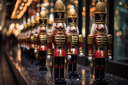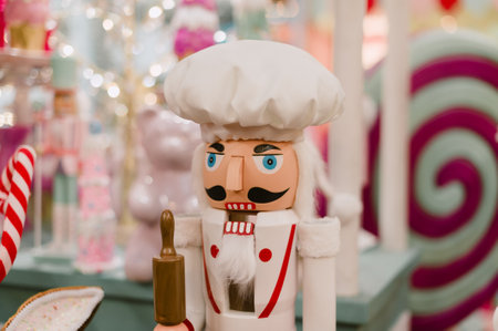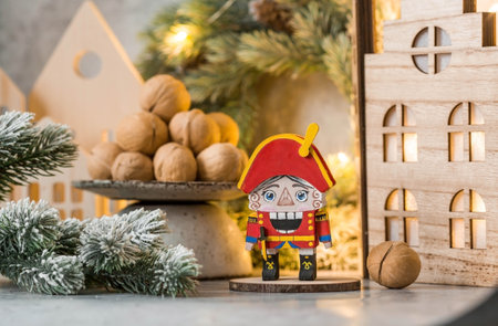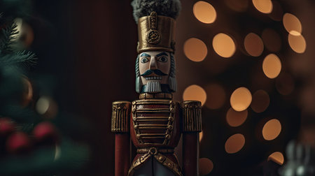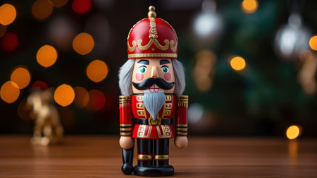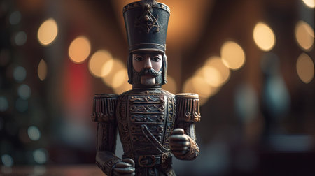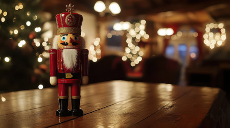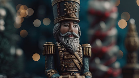 A classic wooden nutcracker stands prominently amidst holiday decorations in this image. Soft focus and warm bokeh lighting create a festive atmosphere. The composition includes miniature figurines and blurred elements in the background, offering potential for commercial and editorial applications.