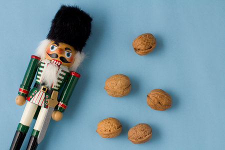 Interesting beautiful christmas nutcracker soldier on blue colored paper surface texture with copy space.