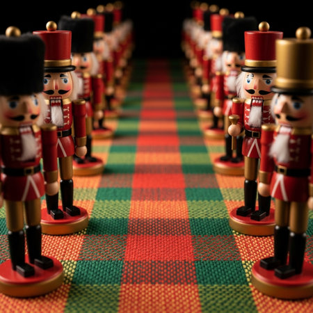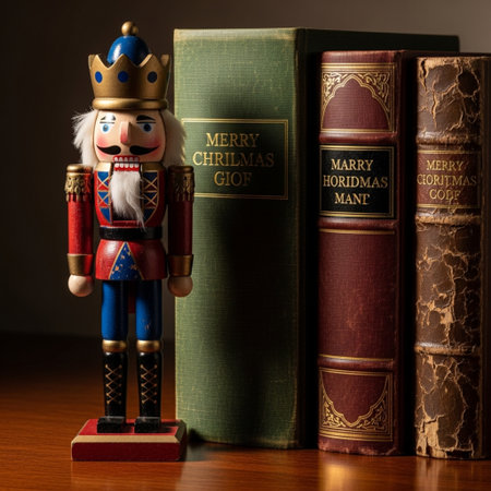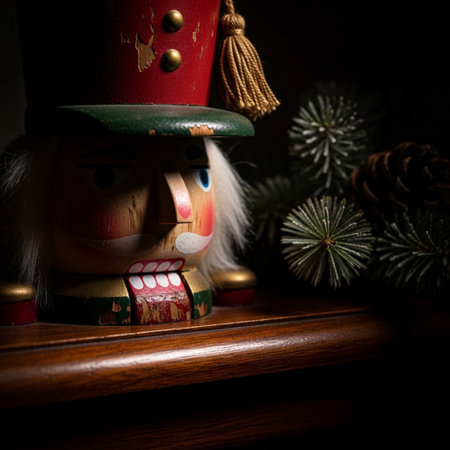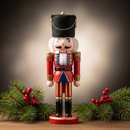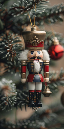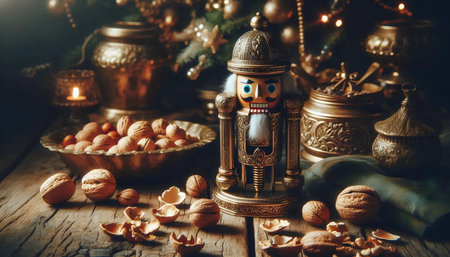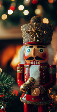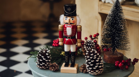 Festive scene showing a classic wooden nutcracker figurine surrounded by pine cones, red berries, and a miniature Christmas tree, evoking the warmth and joy of the holiday season
