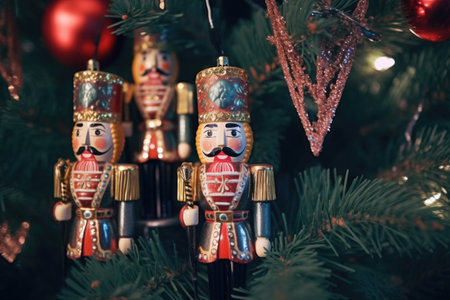 nutcracker figures nestled within pine branches of a christmas tree, created with generative ai