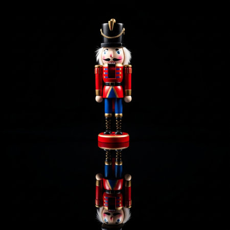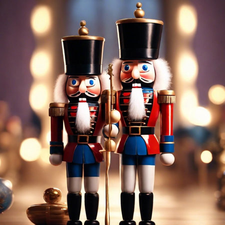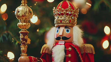 A wooden nutcracker soldier wearing a regal crown and a red cape is prominently displayed, holding a gold staff