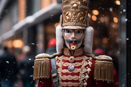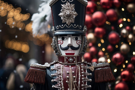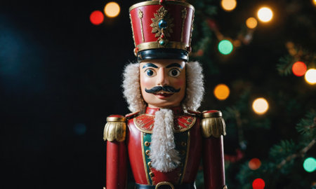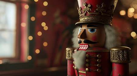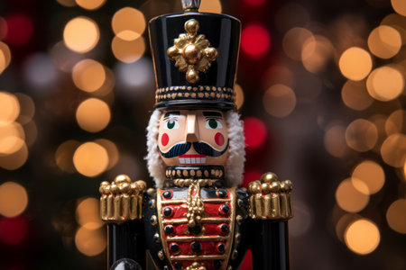 Festive nutcracker soldier with bokeh blurred background. Generative AI illustration