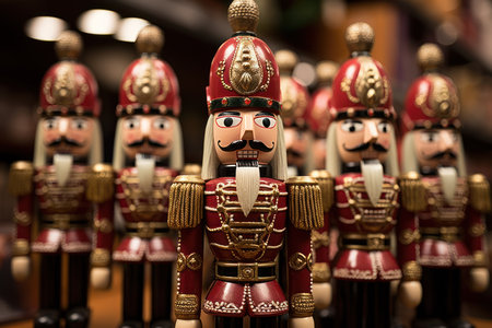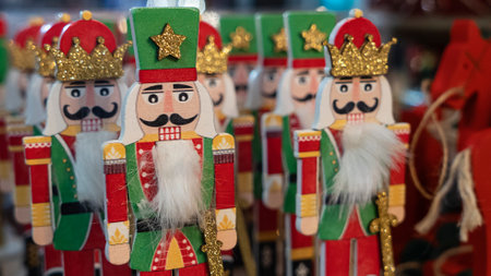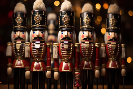 Traditional Christmas holiday wooden nutcrackers, toy soldiers. Generative AI illustration