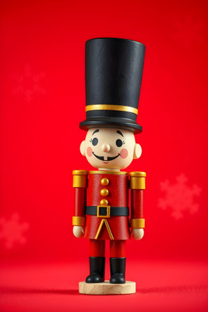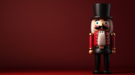 A wooden nutcracker with a black hat and moustache stands on a red background. The nutcracker is the main focus of the image, and the red background adds a sense of warmth and festivity to the scene