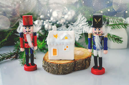 White house in the form of a ceramic candlestick on the background of decorative branches with a Nutcracker figure-Christmas card.