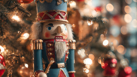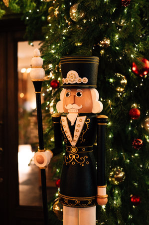 Christmas tree decoration with nutcracker doll in front of Christmas tree