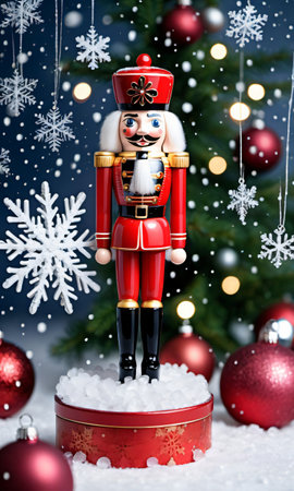 A vintage red nutcracker stands against snow, surrounded by falling flakes of holiday joy.