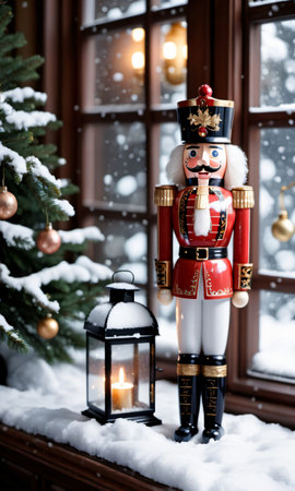 Photo Of Christmas Nutcracker Holding A Lantern Beside A Snowy Window. Generative AI