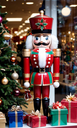 Christmas nutcracker toy in front of a shop window with lights in the background