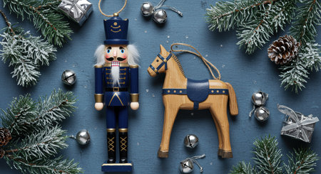 Traditional wooden nutcracker and toy horse ornaments surrounded by pine branches, silver bells, and festive decorations.