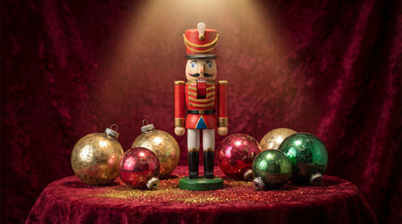 Classic nutcracker toy standing among Christmas ornaments on festive background
