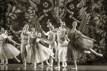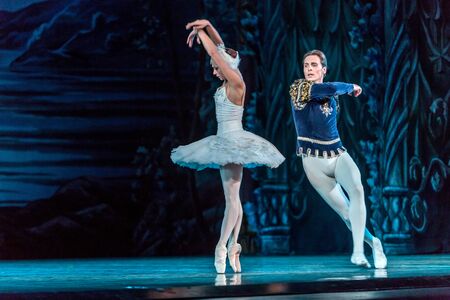 ODESSA, UKRAINE -JULY22, 2019: ballet. Classical ballet on stage of Odessa Opera Theater. Ballet dancers on stage dance classical works of Swan Lake. Form of artistic ball dance on stage of theater
