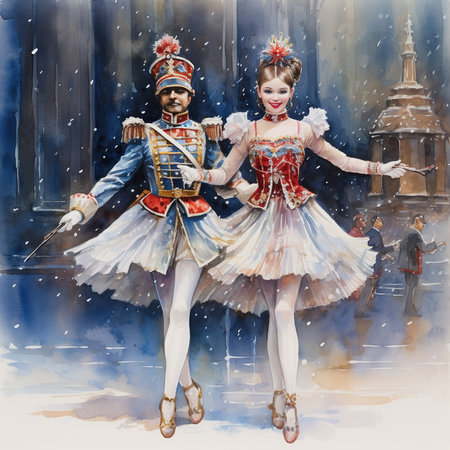 A festive Christmas scene featuring a nutcracker, ballet pointe shoes, ornaments, and holiday greenery arranged on a pink backdrop.