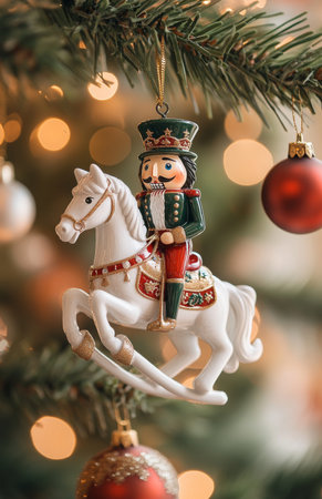 Colorful nutcracker on white rocking horse with festive red and green ornaments on pine branch