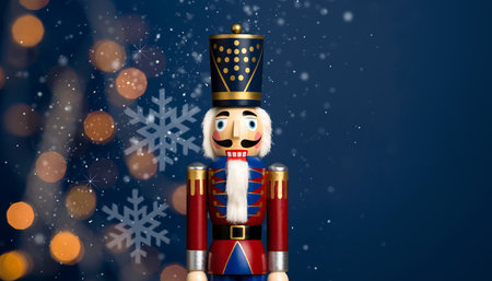 A vibrant nutcracker stands proudly with colorful details surrounded by a soft bokeh backdrop, capturing the festive spirit of the holiday season.