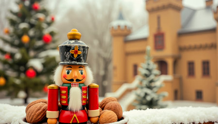A charming Nutcracker soldier guards walnuts and a whimsical castle. A fairytale atmosphere of New Year and Christmas, Christmas Eve, magic and witchcraft