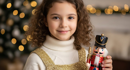 A smiling girl with curly brown hair holds a red and black nutcracker toy. A Christmas tree with gold bokeh lights is visible in the background. The girl is wearing a white sweater with gold accents.