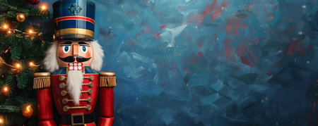 Festive scene showing a classic wooden nutcracker figurine surrounded by pine cones, red berries, and a miniature Christmas tree, evoking the warmth and joy of the holiday season