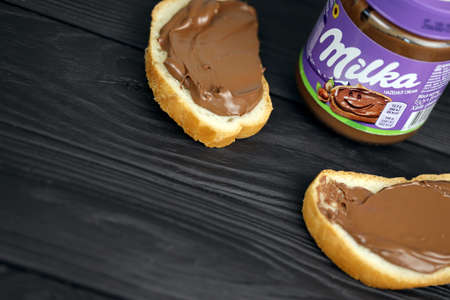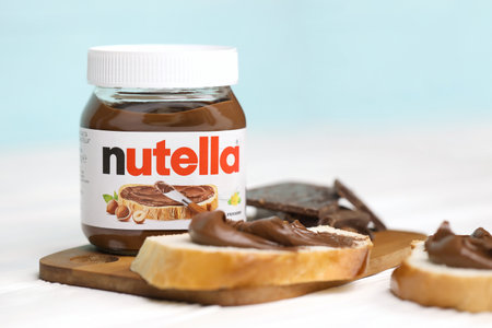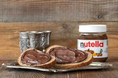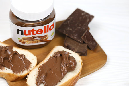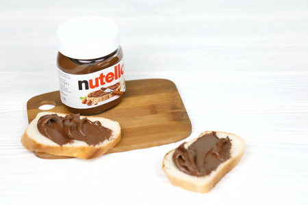 SUMY, UKRAINE - MARCH 12, 2020: Slices of bread with nutella- world famous Italian hazelnut cocoa spread