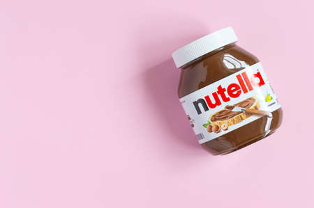 KREMENCHUG, UKRAINE - OCTOBER 9, 2021: Nutella - hazelnut chocolate spread in a glass jar on a pink background with copy space, top view. Widely popular brand name by Italian company Ferrero.