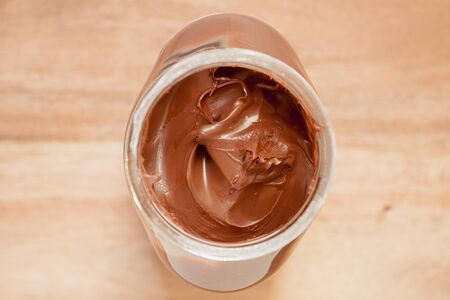 Chocolate spreading cream in glass jar viewed from above.Selective focus with shallow depth of field.