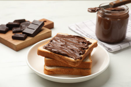 Chocolate spread on toast on plate, close up, food photography