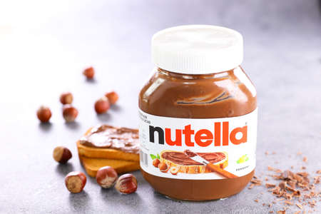 Tyumen, Russia-October 15, 2021: Nutella chocolate paste with hazelnuts. Morning breakfast with bread pasta and nuts