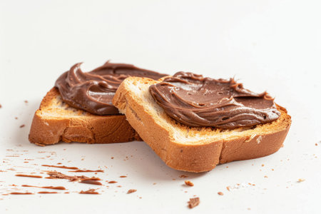 Chocolate spread on toast, white background, close-up