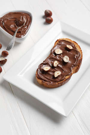 Plate of bread with chocolate paste and hazelnuts on white wooden background